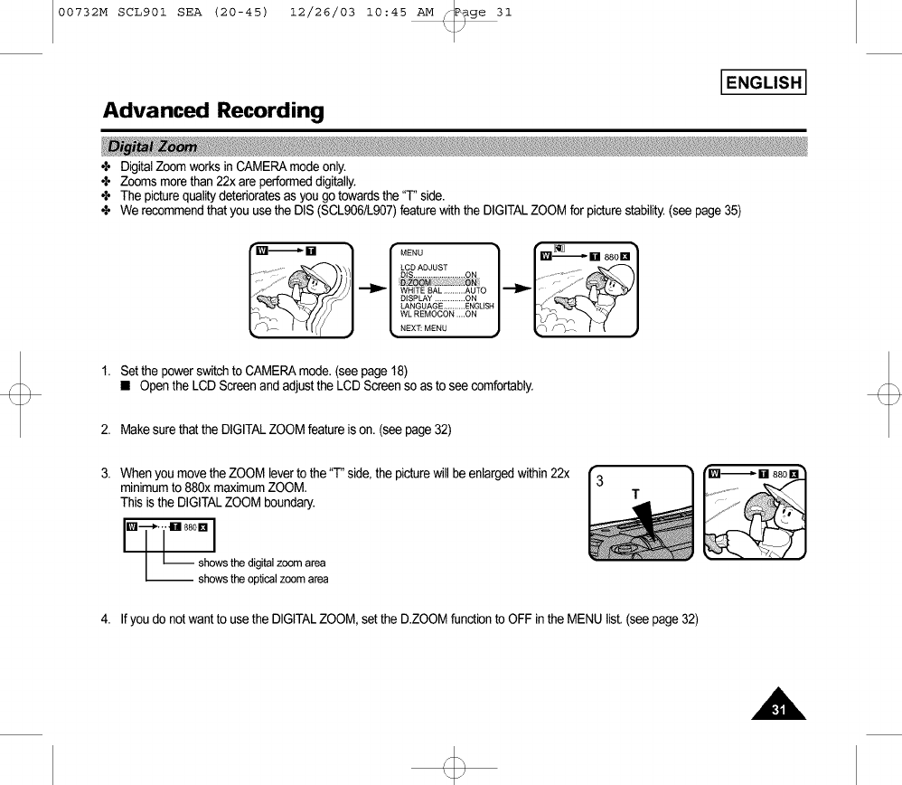 ÷ We recommendthat youusethe DIS (SCL906/L907)featurewiththe DIGITALZOOMforpicturestability.(seepage35)