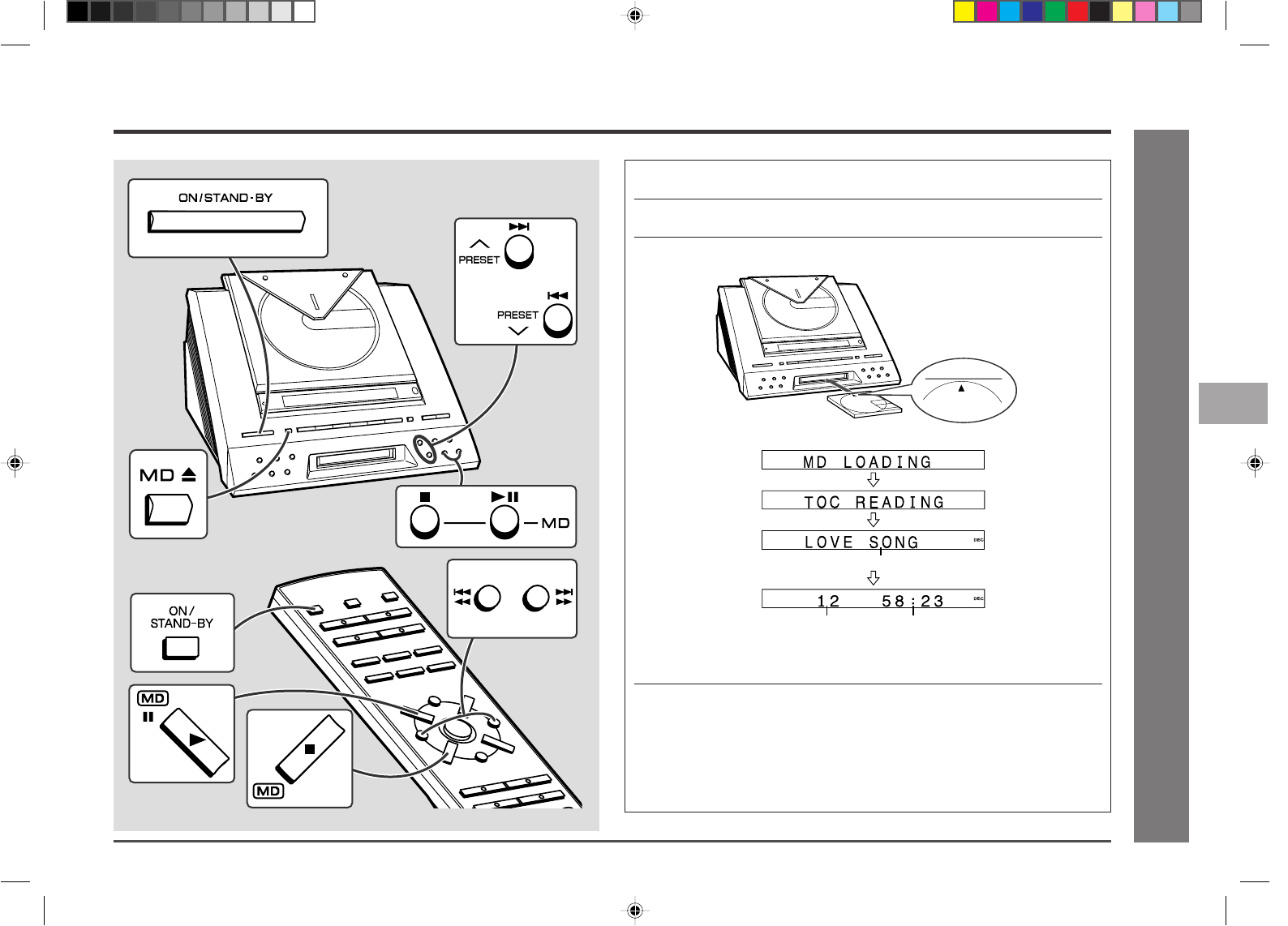 3 Load a MiniDisc into the MD compartment, label side up.