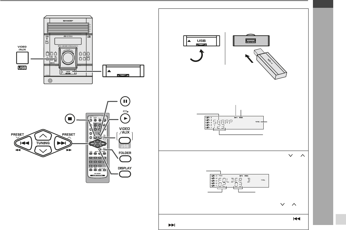 1 Press the VIDEO/AUX/USB (USB/AUX) button, and push up