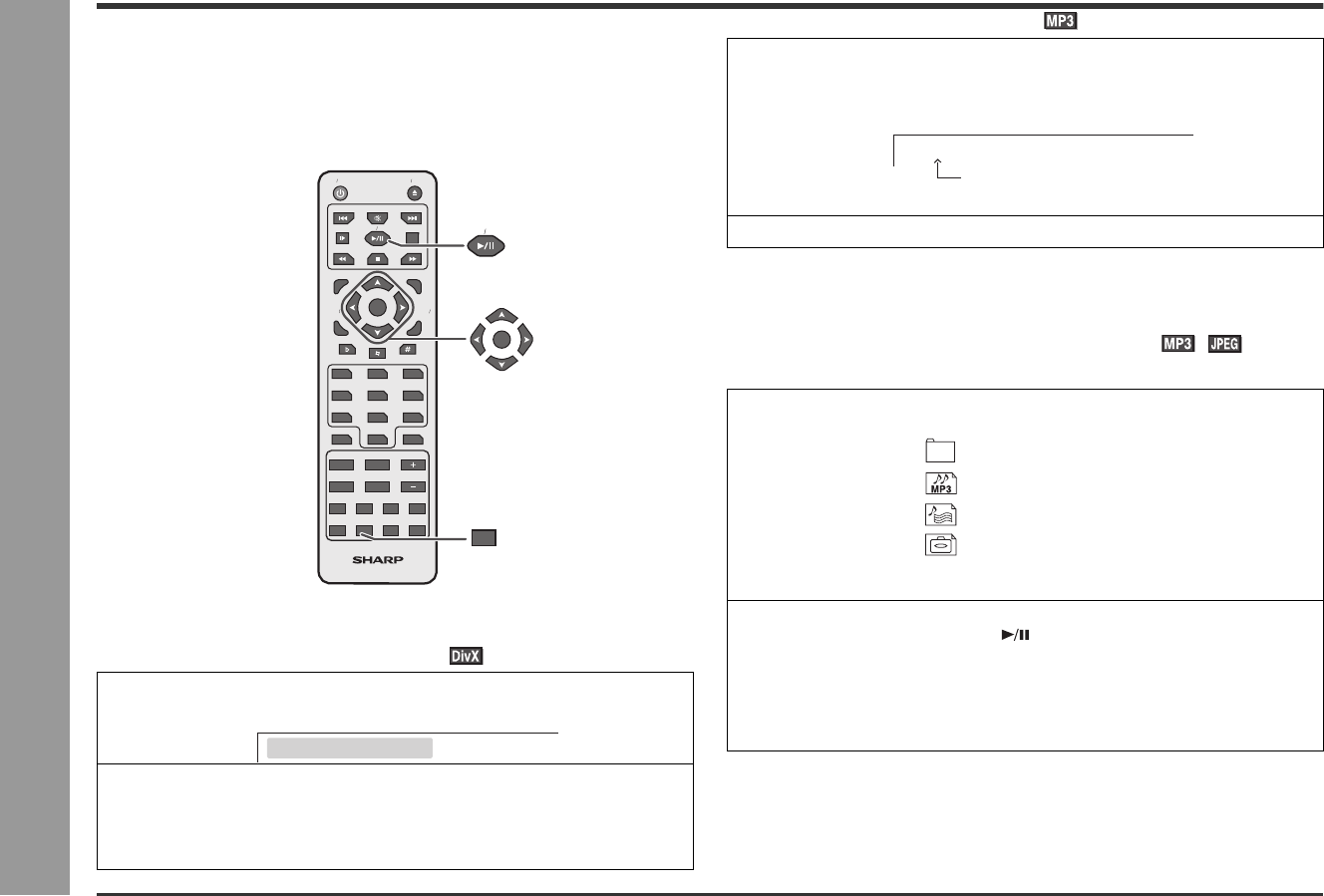 - MP3/WMA, JPEG and DivX disc operation -