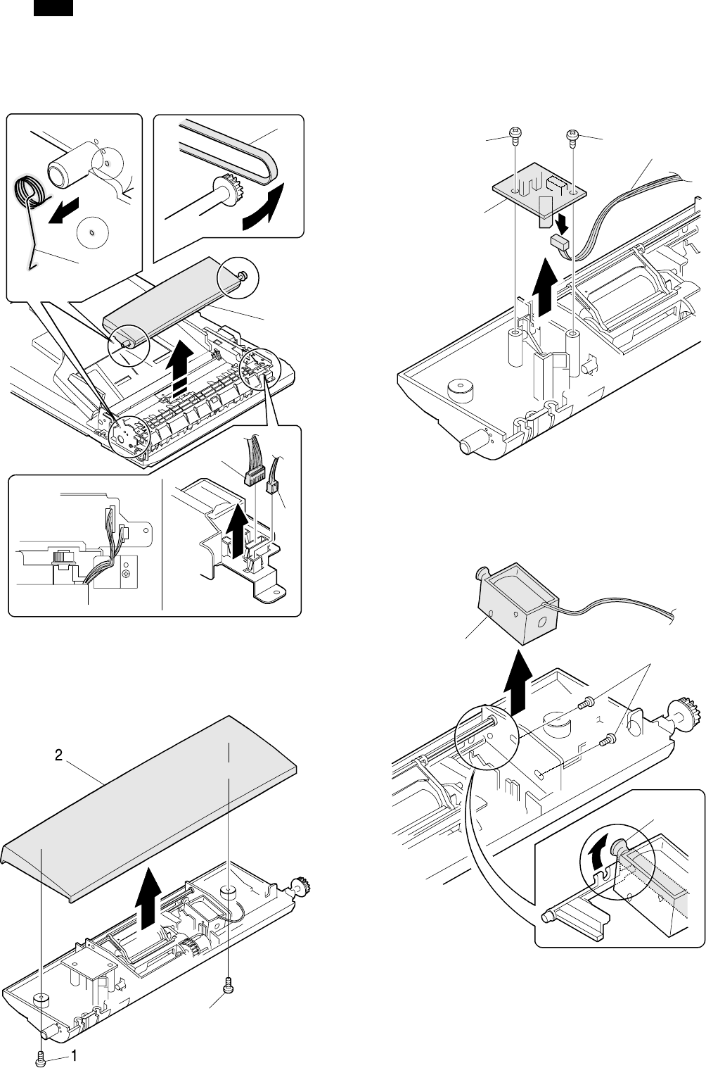 1) Remove the belt, the paper feed frame spring, and two harnesses.