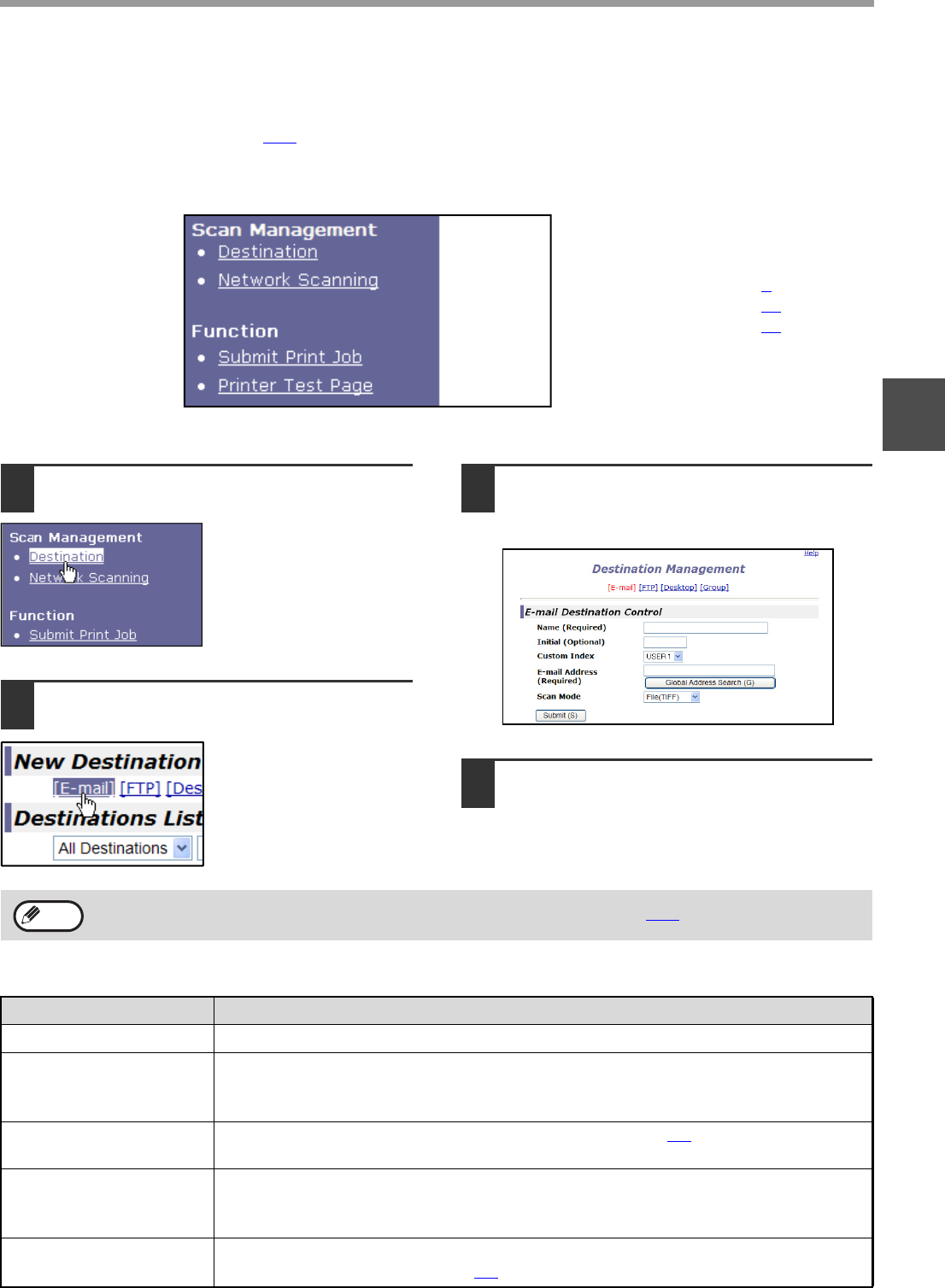 To store scanning destinations, click [Destination] in the Web page menu frame. This screen can also be used to