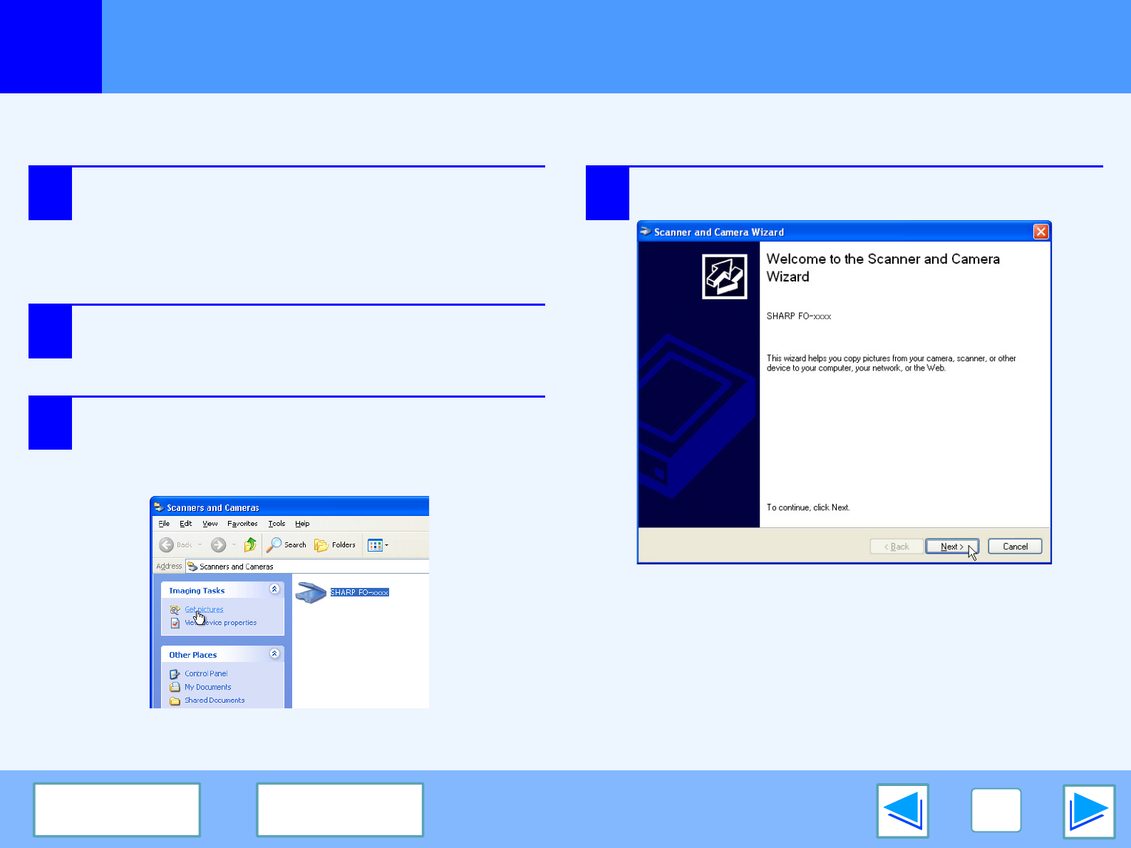 The procedure for scanning with the "Scanner and Camera Wizard" in Windows XP is explained here. The "Scanner and Camera