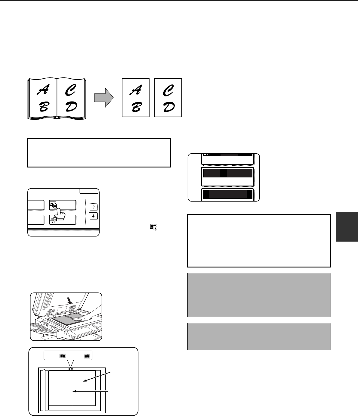 The dual page copy function produces separate copies of two documents placed side by side on the document glass.