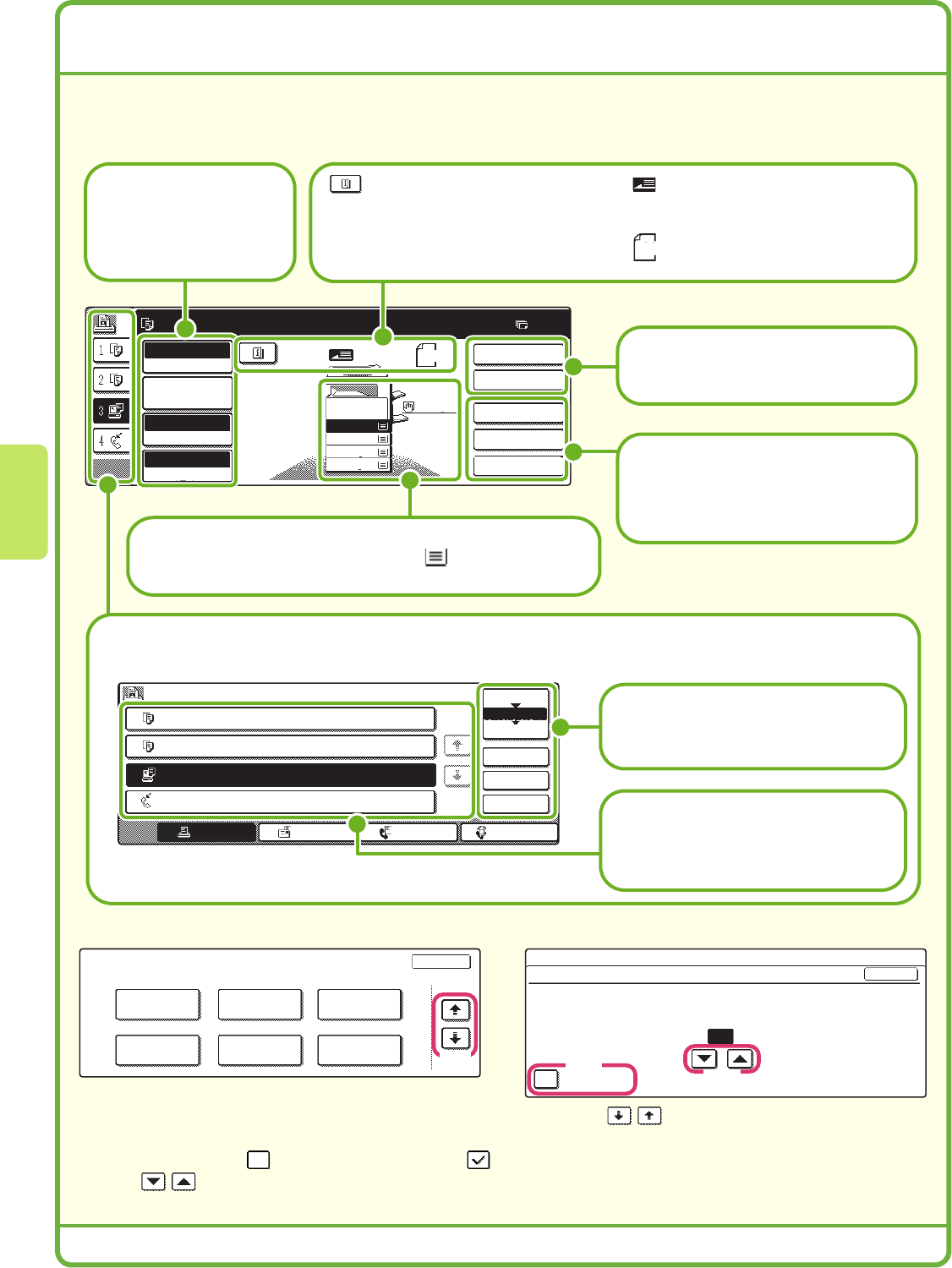 The touch keys that appear in the touch panel are grouped for easy operation. The layout and functions of the