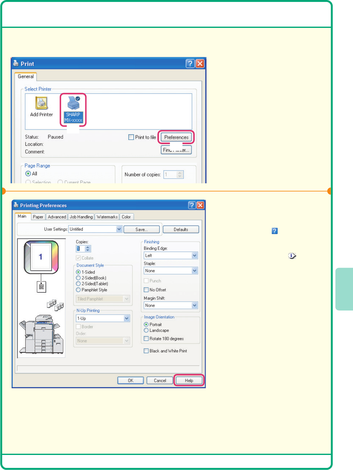 When selecting settings in the printer driver properties window, you can display Help to view explanations of the
