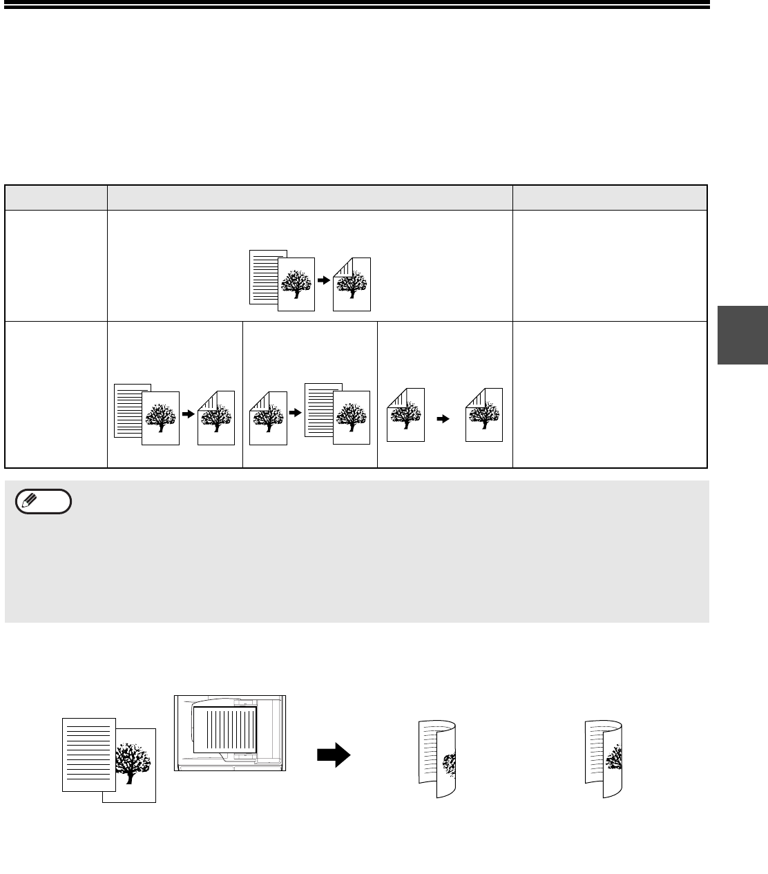 DUPLEX COPYING" (p.29) or in the user programs (p.44), and then follow the steps below. In particular, when