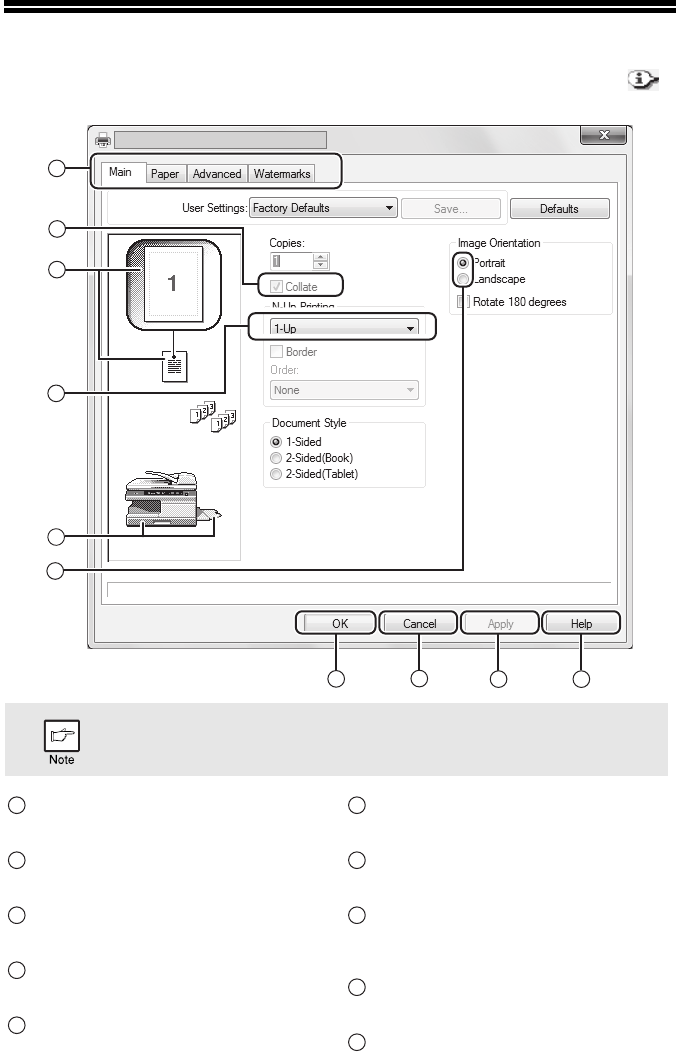 printer driver setup screen. When a restriction is in effect, an information icon ( )
