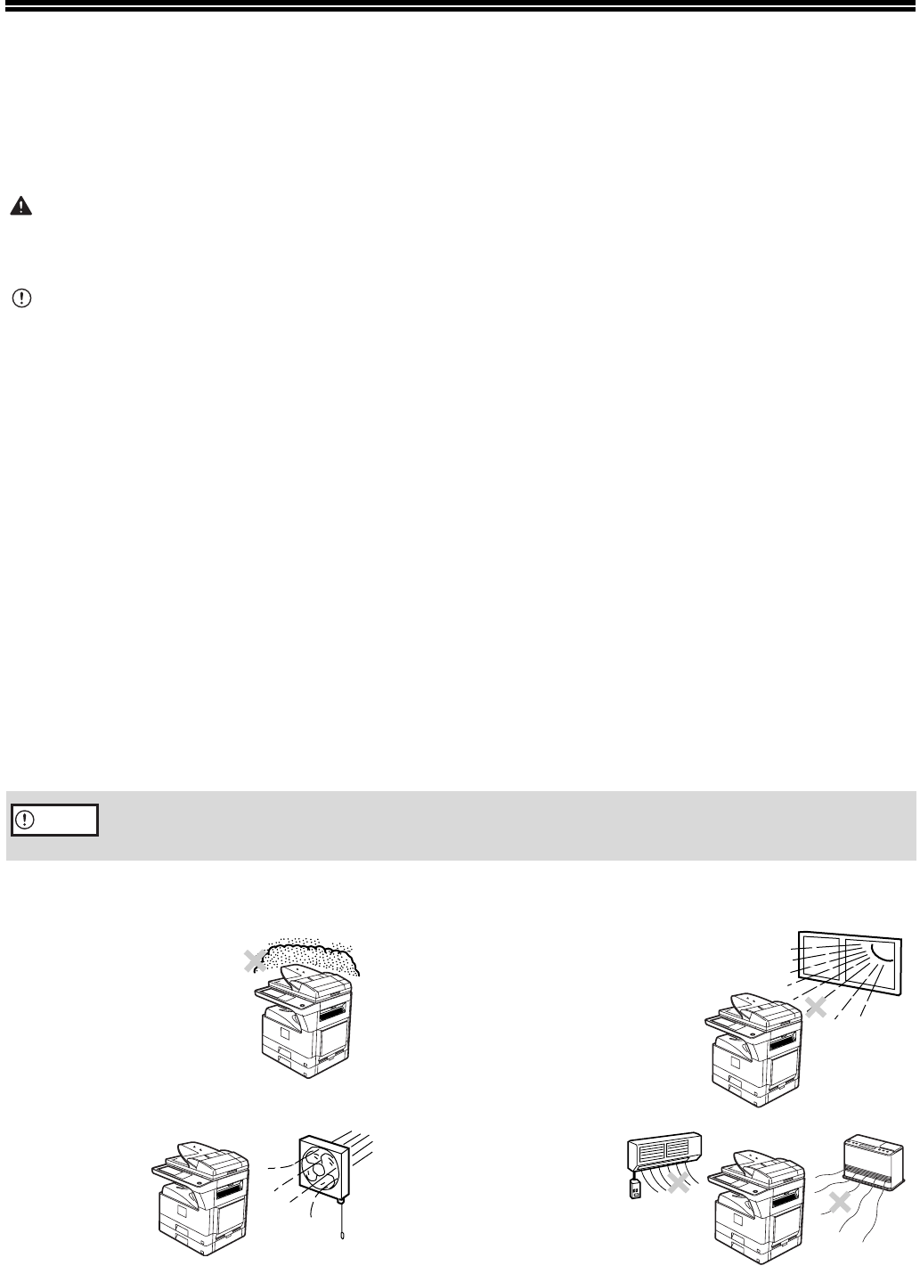 • Do not cover the machine with a dust cover, cloth or plastic film while the power is on. Doing so may prevent heat