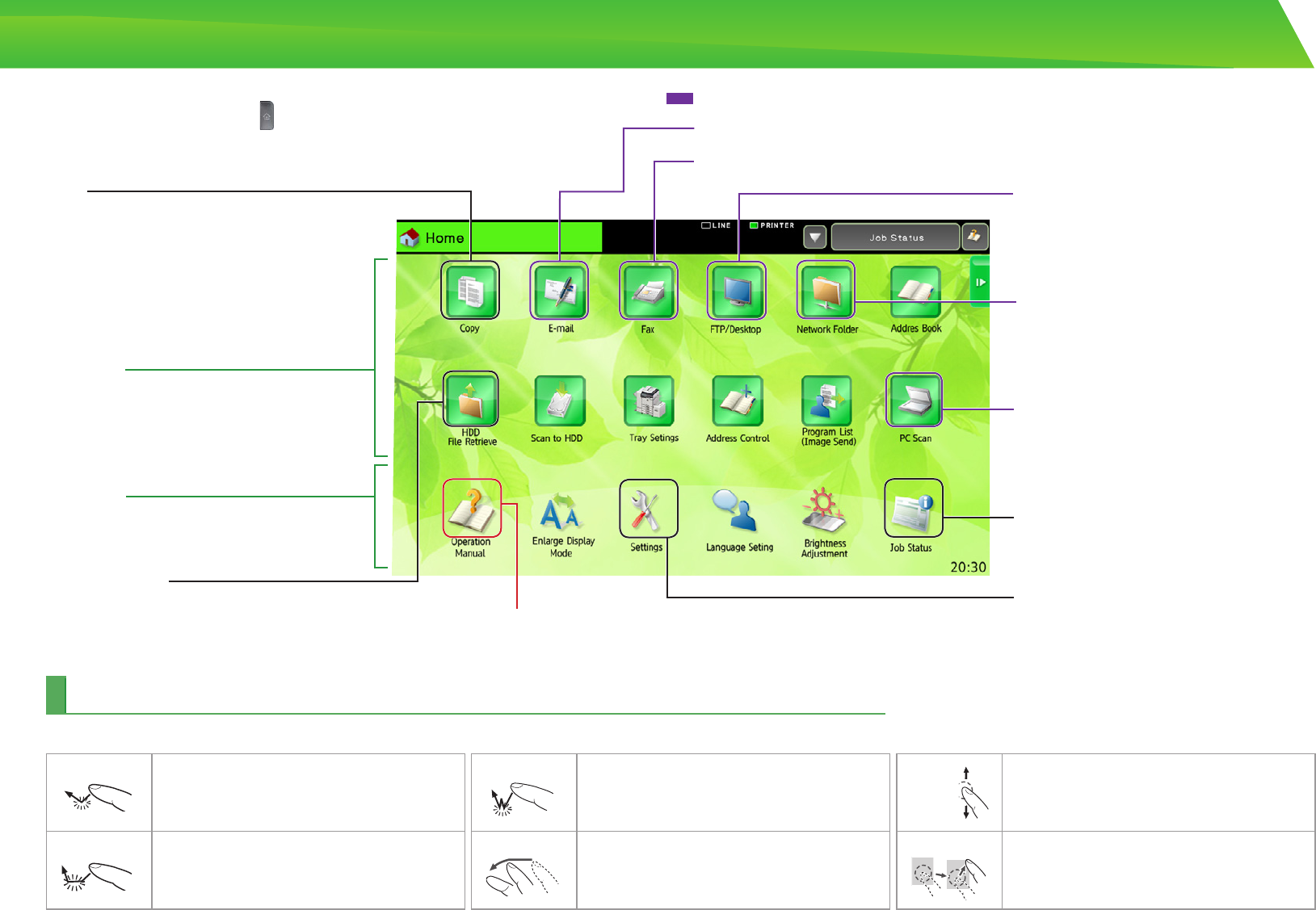In addition to the conventional "single tap" operation, you can also operate the touch panel using long touches, icks, and slides.