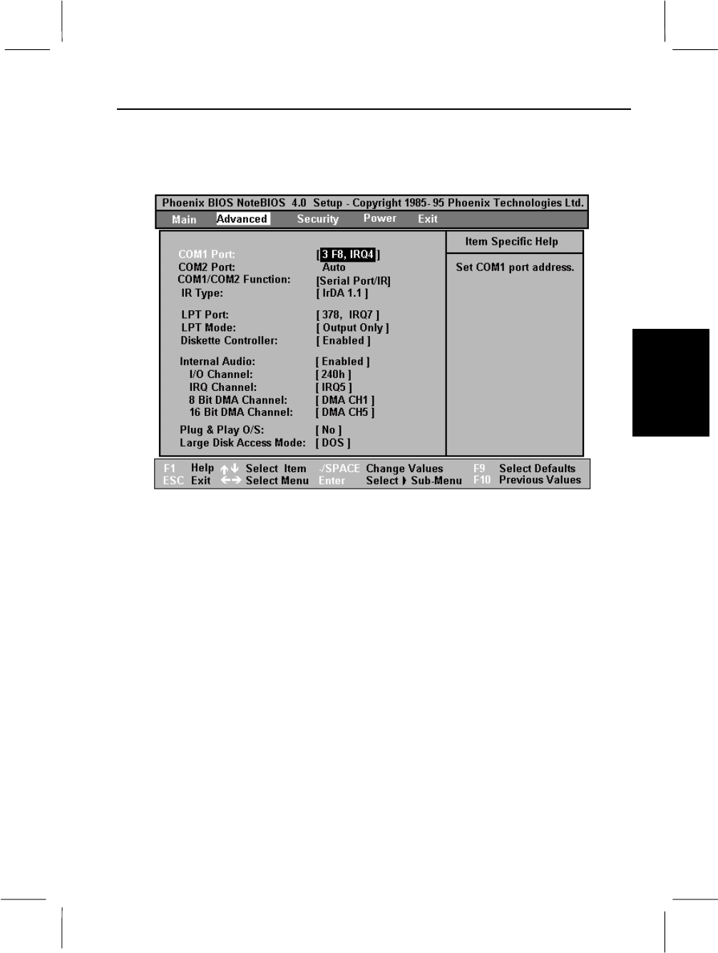 COM1 Port Indicates the I/O address and interrupt (IRQ) to be used when COM1 is