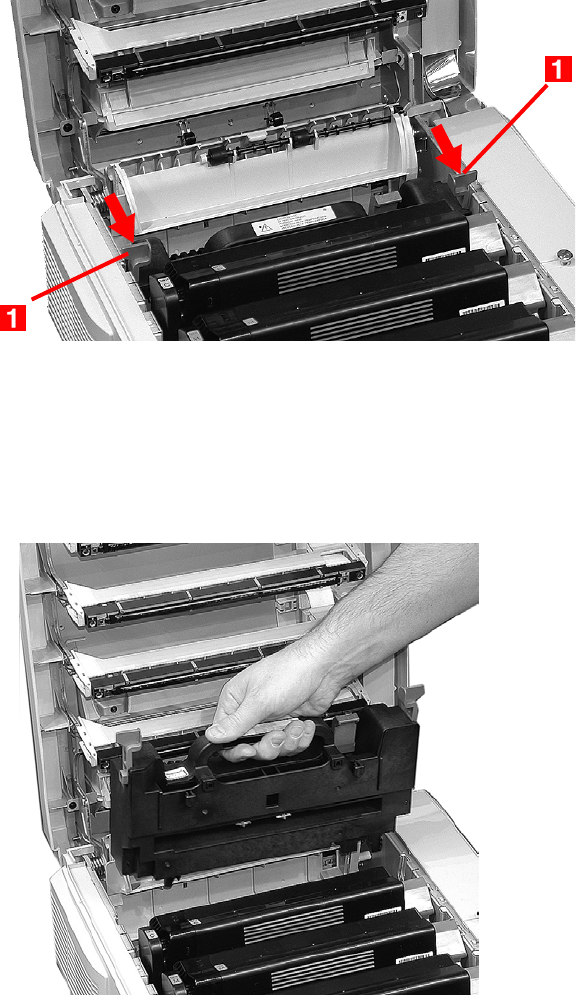 2. Pull the two blue fuser lock levers (1) towards the front