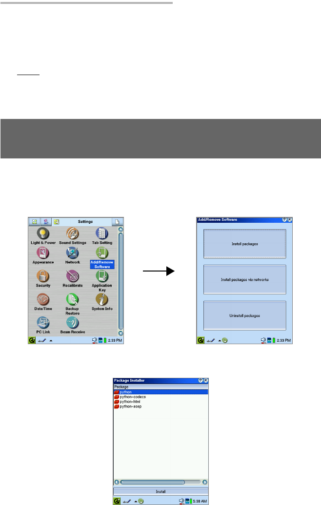 Install the software you copied onto the Zaurus for use with the Add/Remove Software application.
