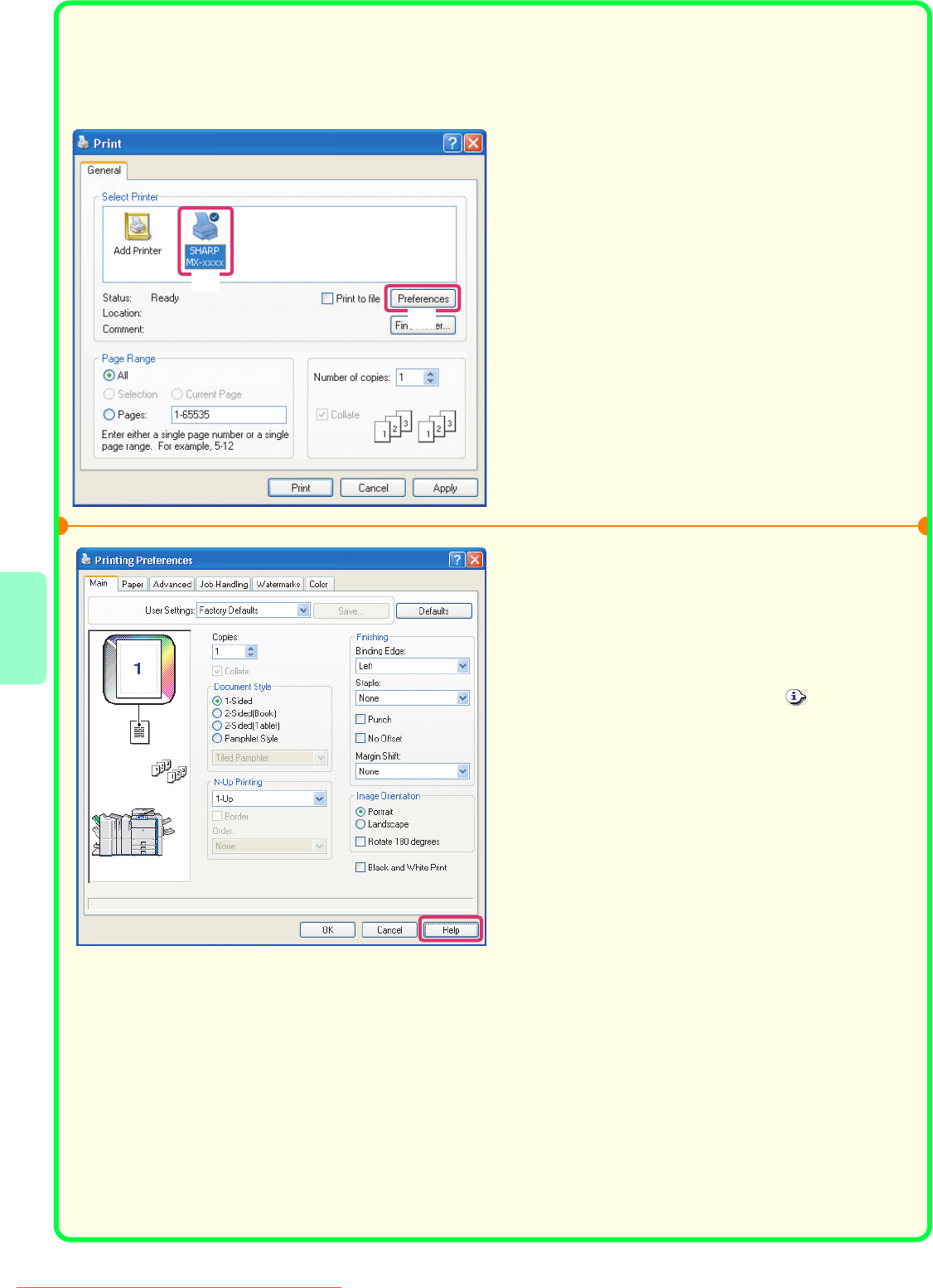 When selecting settings in the printer driver properties window, you can display Help to view explanations of the