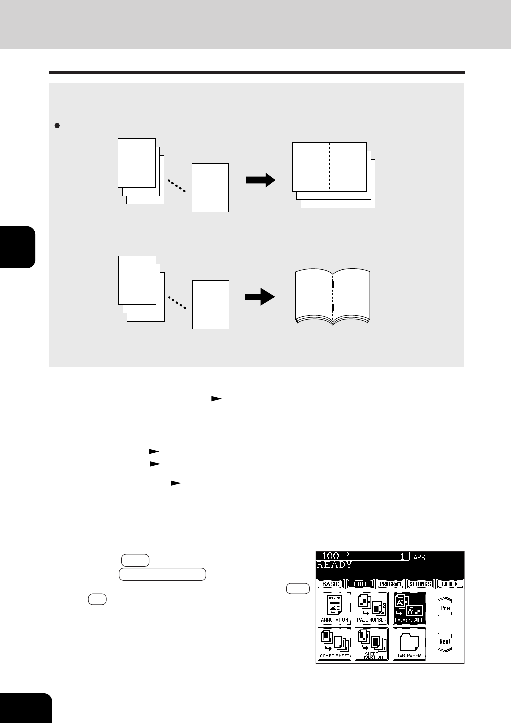 The magazine sort mode allows 1-sided originals to be copied and sorted so that they can be folded and