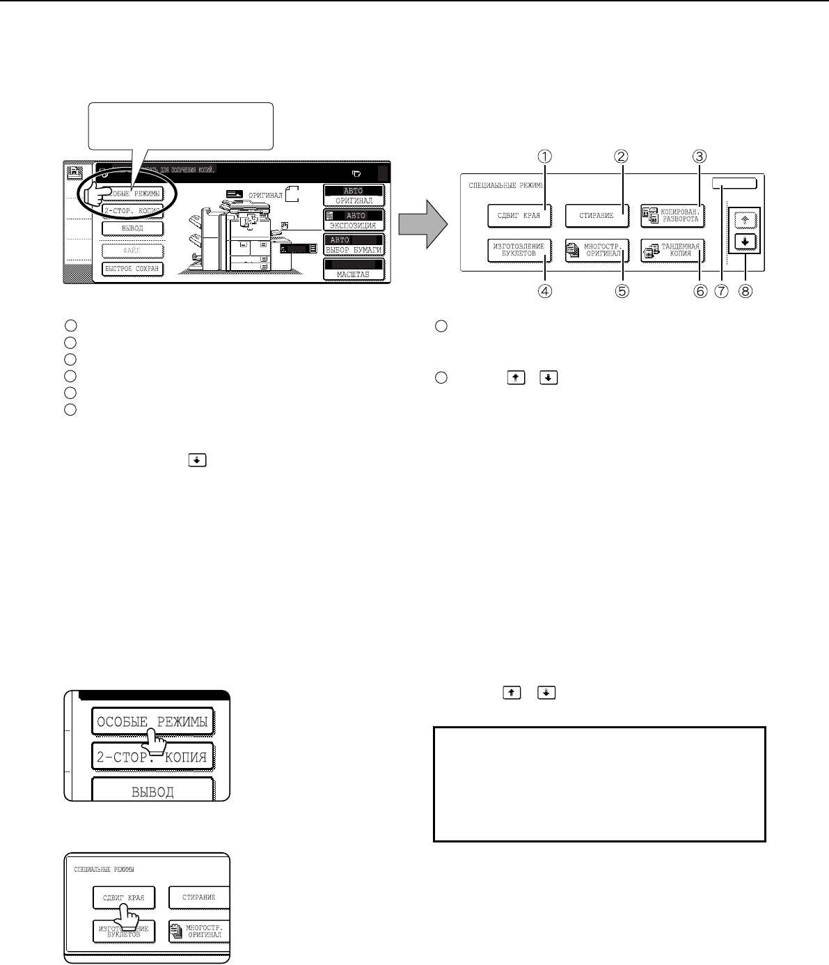 Чтобы отêрыть эêран специальных режимов, приêоснитесь ê êнопêе [Особые режимы] на основном эêране режима êопирования. На