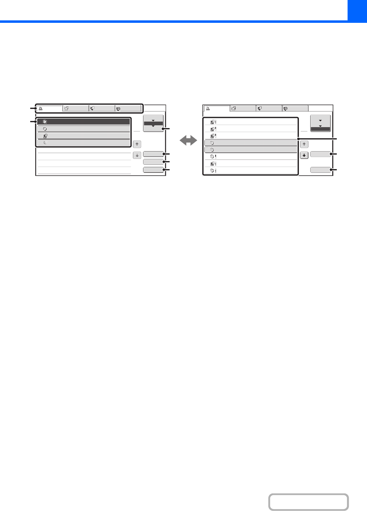screen switches between the job queue screen and the completed jobs screen each time the job status screen selector