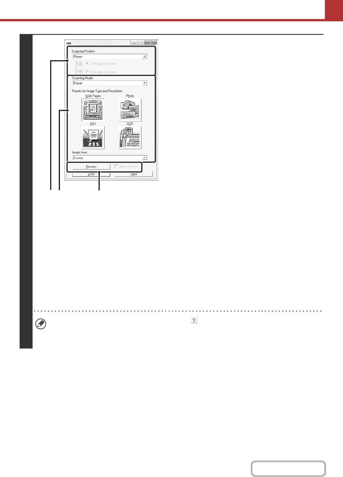 • For further information on the scan settings, click the button in the preview image screen of step 7 to