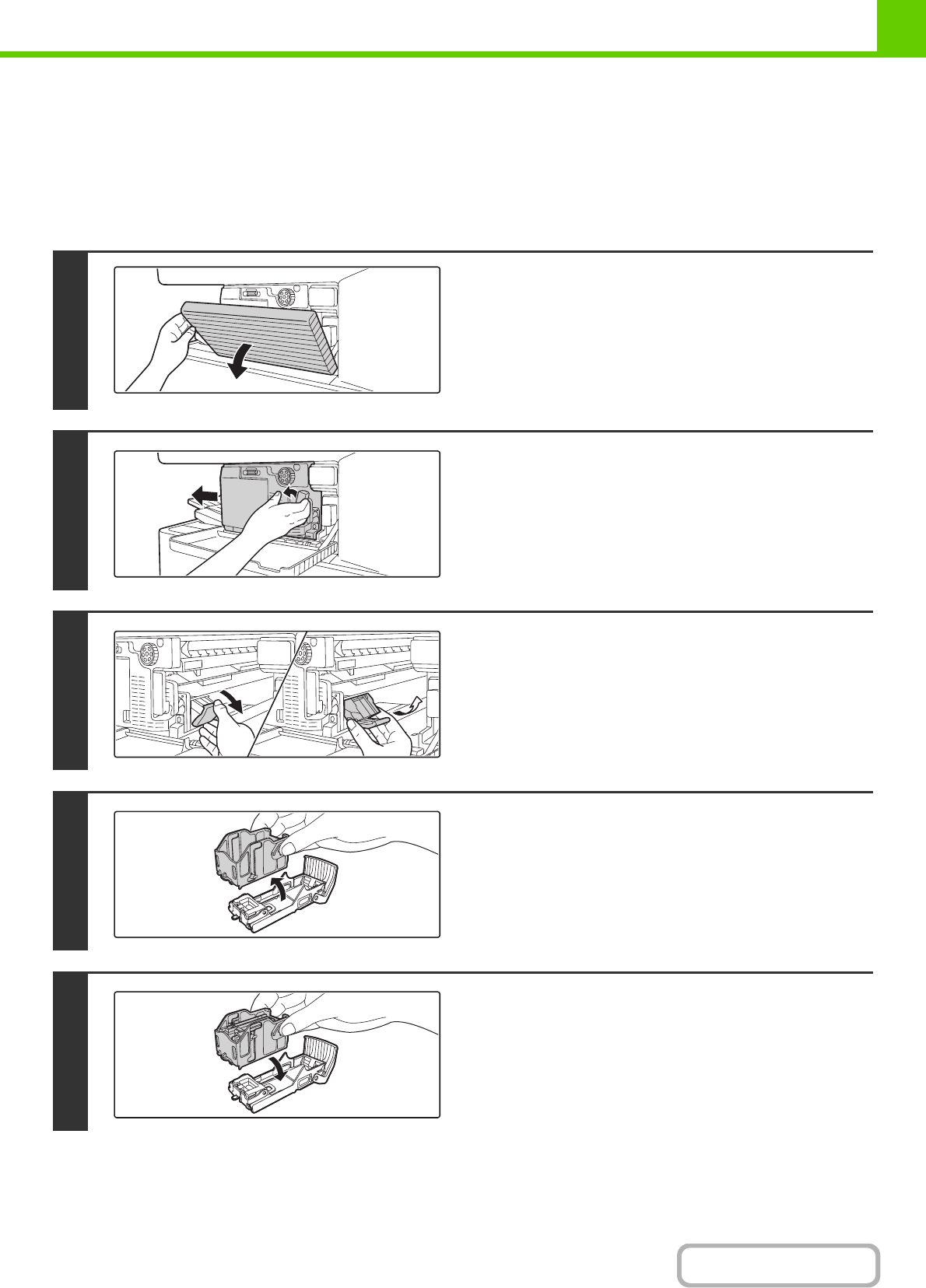 When the staple cartridge runs out of staples, a message will appear in the operation panel. Follow the procedure below