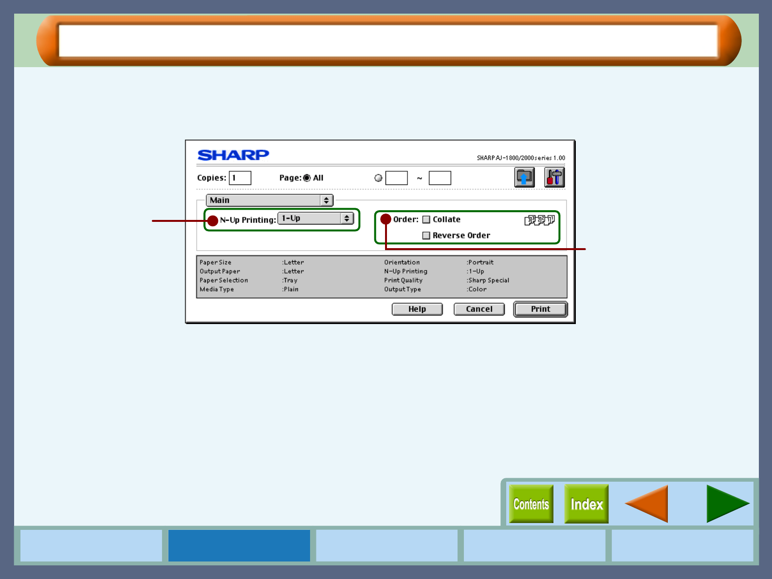On this dialog box, you can specify the values for "N-Up Printing" and paper output order.