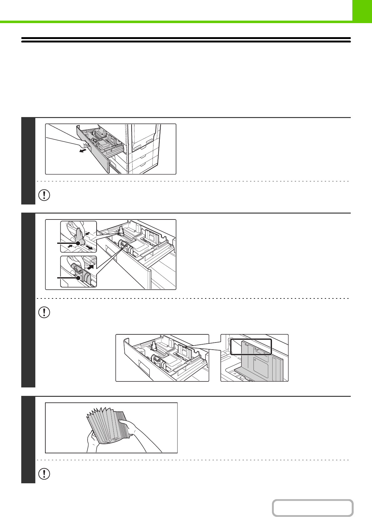 A maximum of 500 sheets of paper from size 7-1/4" x 10-1/2" to size 8-1/2" x 14" (B5 to A4) can be loaded in trays 3 and 4.