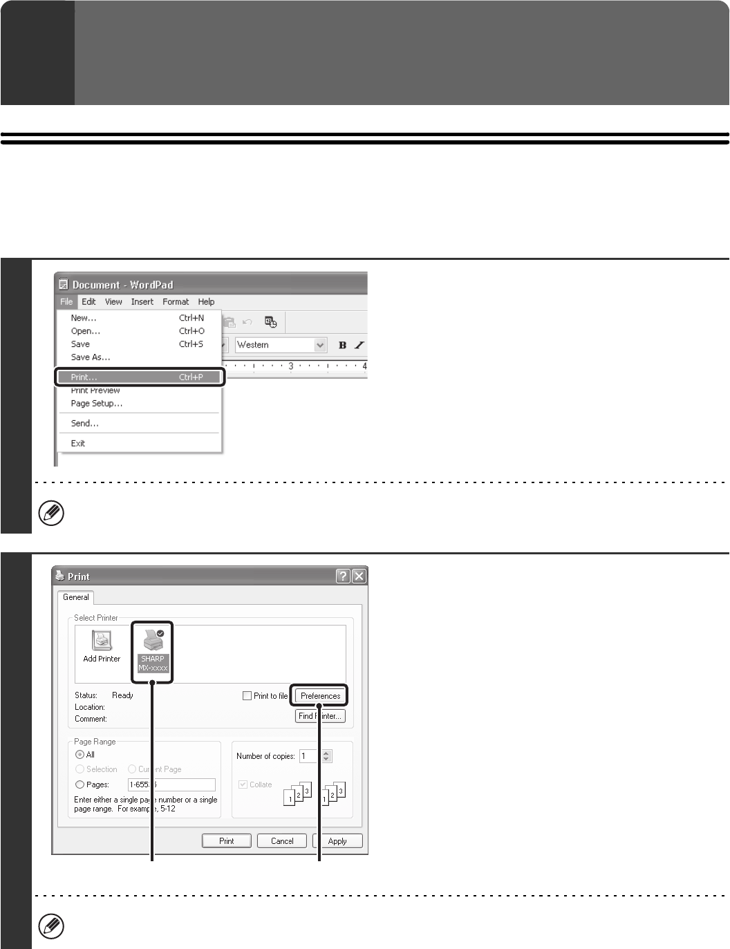 The following example explains how to print a document from "WordPad", which is a standard accessory program in