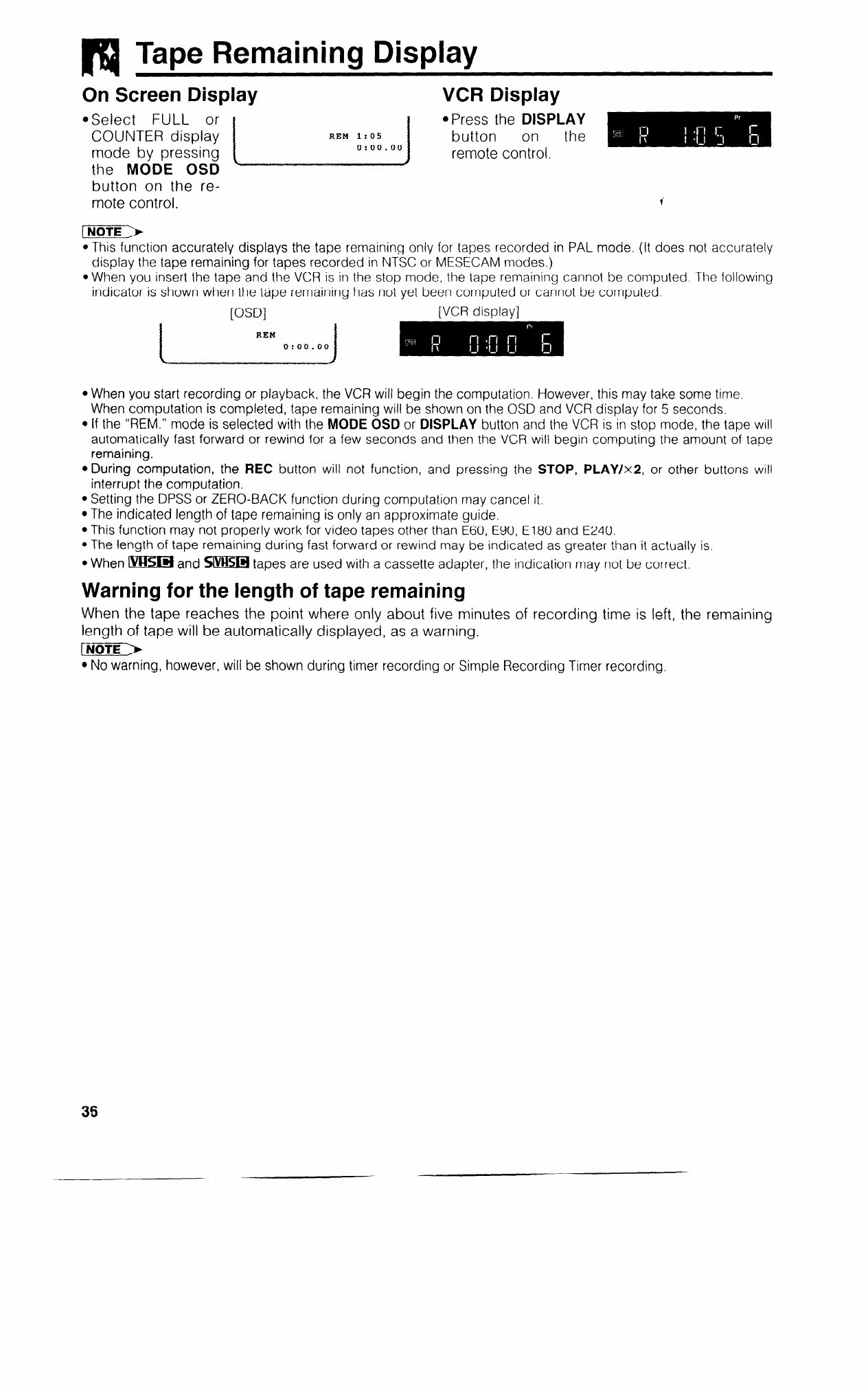When computation is completed, tape remaining will be shown on the OSD and VCR display for 5 seconds.