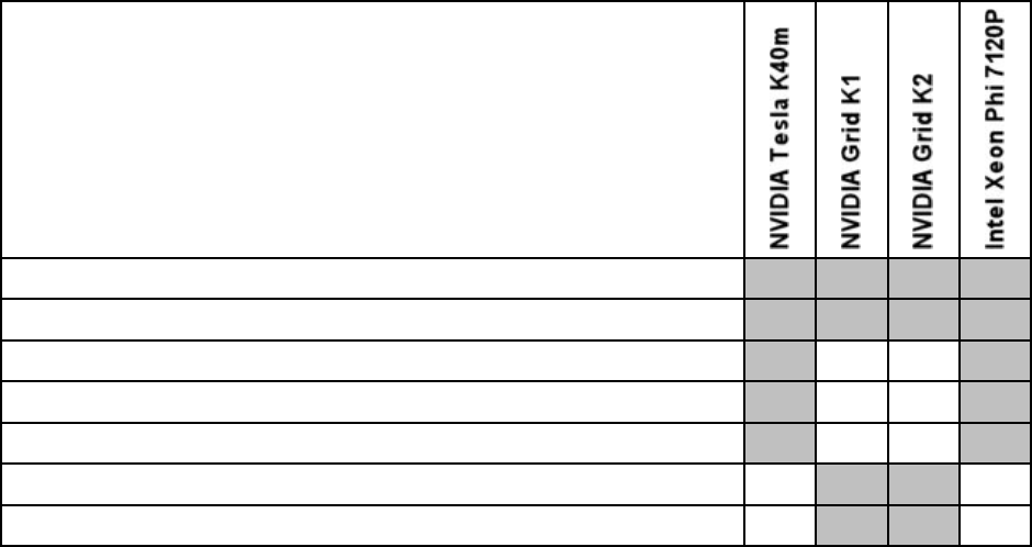 The following table lists the operating system support for GPUs and coprocessors.