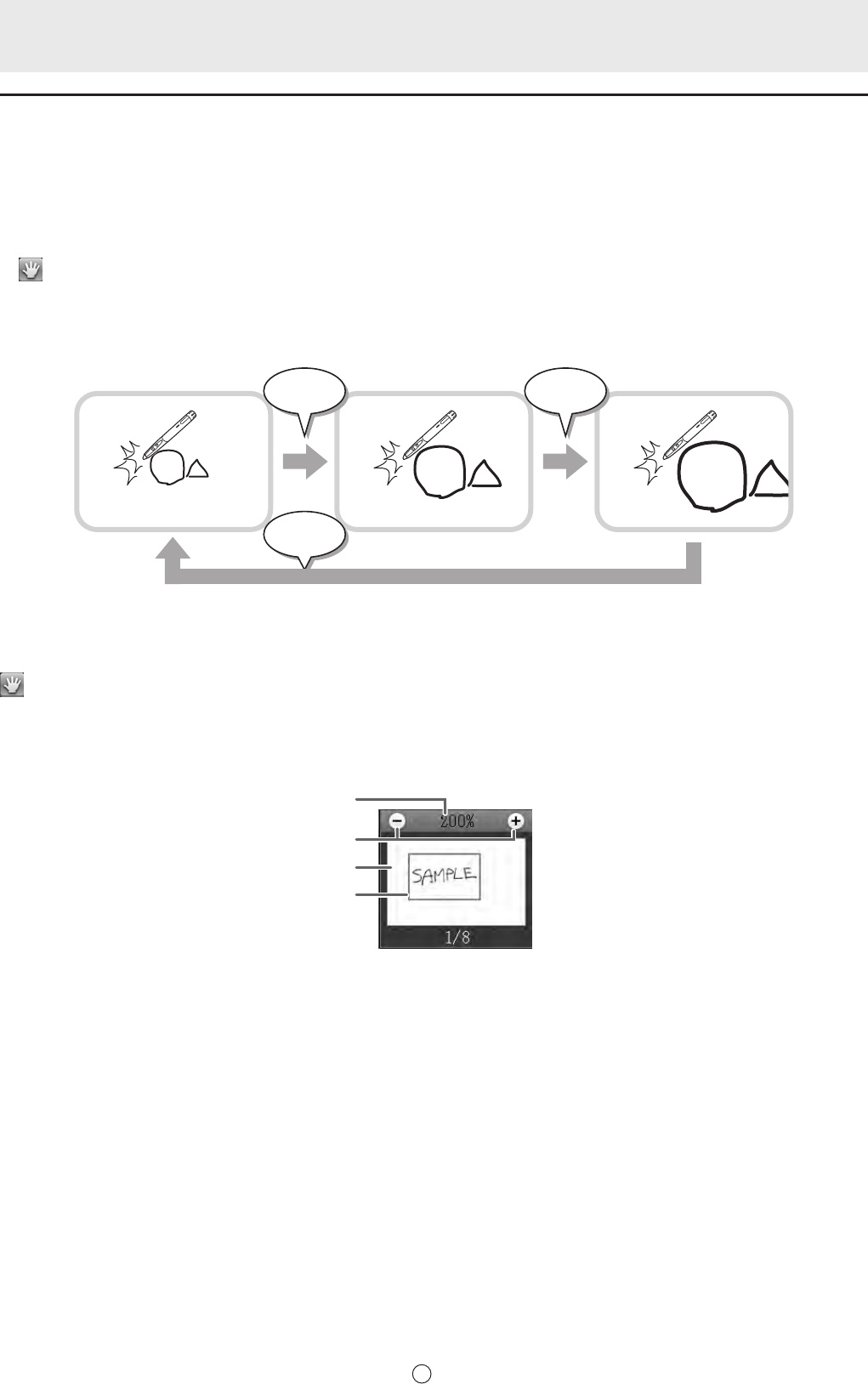 タッチするたびに、100% ~ 400% の間で 50% ずつ画面を拡大/縮小します。