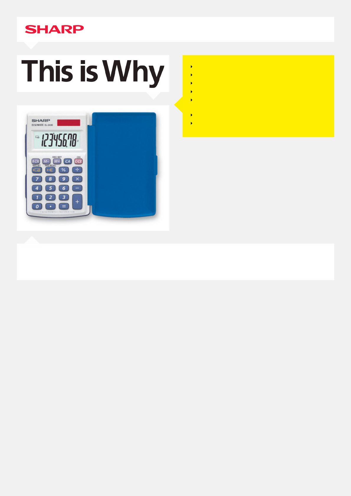 GENERALETipo: TascabileDisplay: LCDCifre: 8FUNZIONIMemoria: 1 (3 tasti)Percentuale (%): Radice (√): Cambio di segno: ALTRISpegnimento automatic